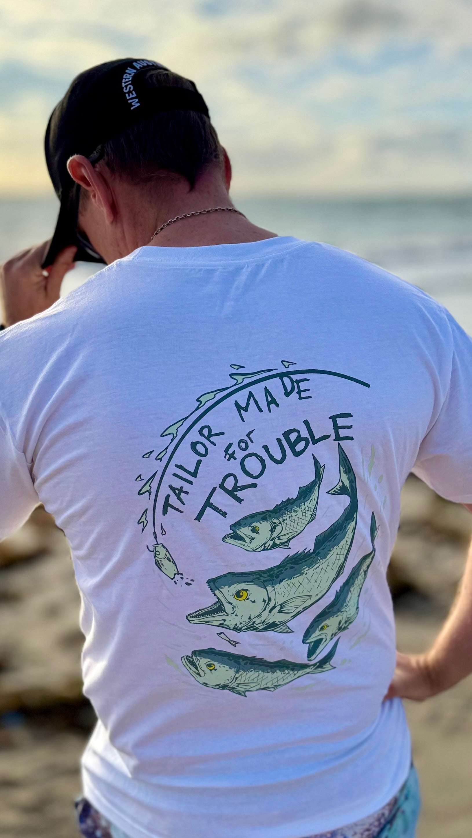 Tailor are the street thugs of WA’s surf zone—fast, aggressive, and always causing trouble. Known for biting tails clean off baitfish and stirring up the shallows, they’re the reason beach rods stay loaded and fingers stay wary. This tee pays tribute to the bitey little battlers who punch above their weight and keep fishos on their toes.